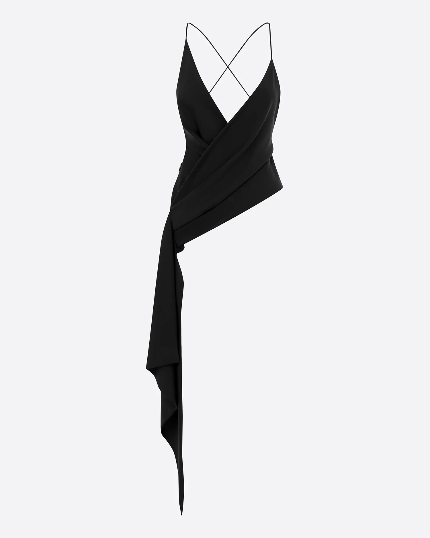 Wrap style top with bias cut asymmetric hem featuring thin cross straps over an open back.