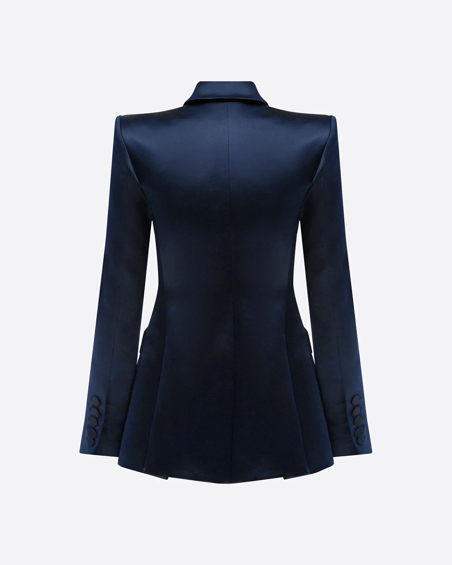 Single breasted fitted blazer constructed in a duchess satin, tailored to a structured, hourglass silhouette.