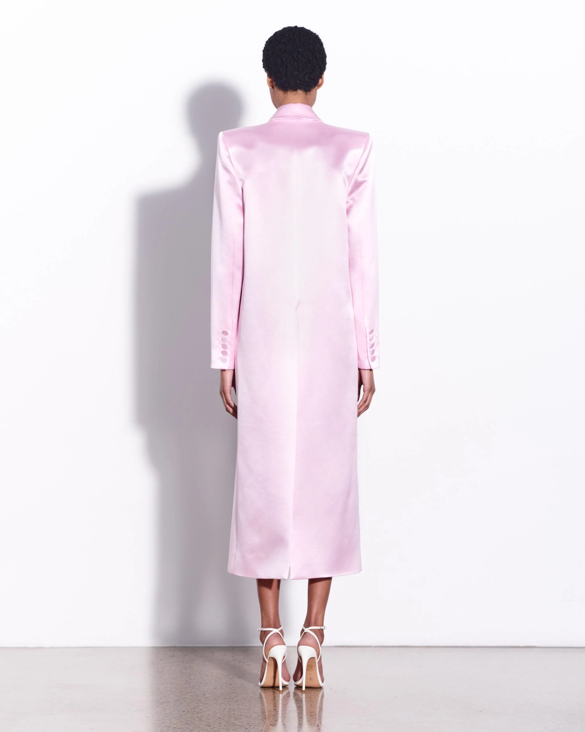 Styled with Double Breasted Oversize Coat in Duchess Satin and Low Rise Draped Mini Skirt in Duchess Satin
