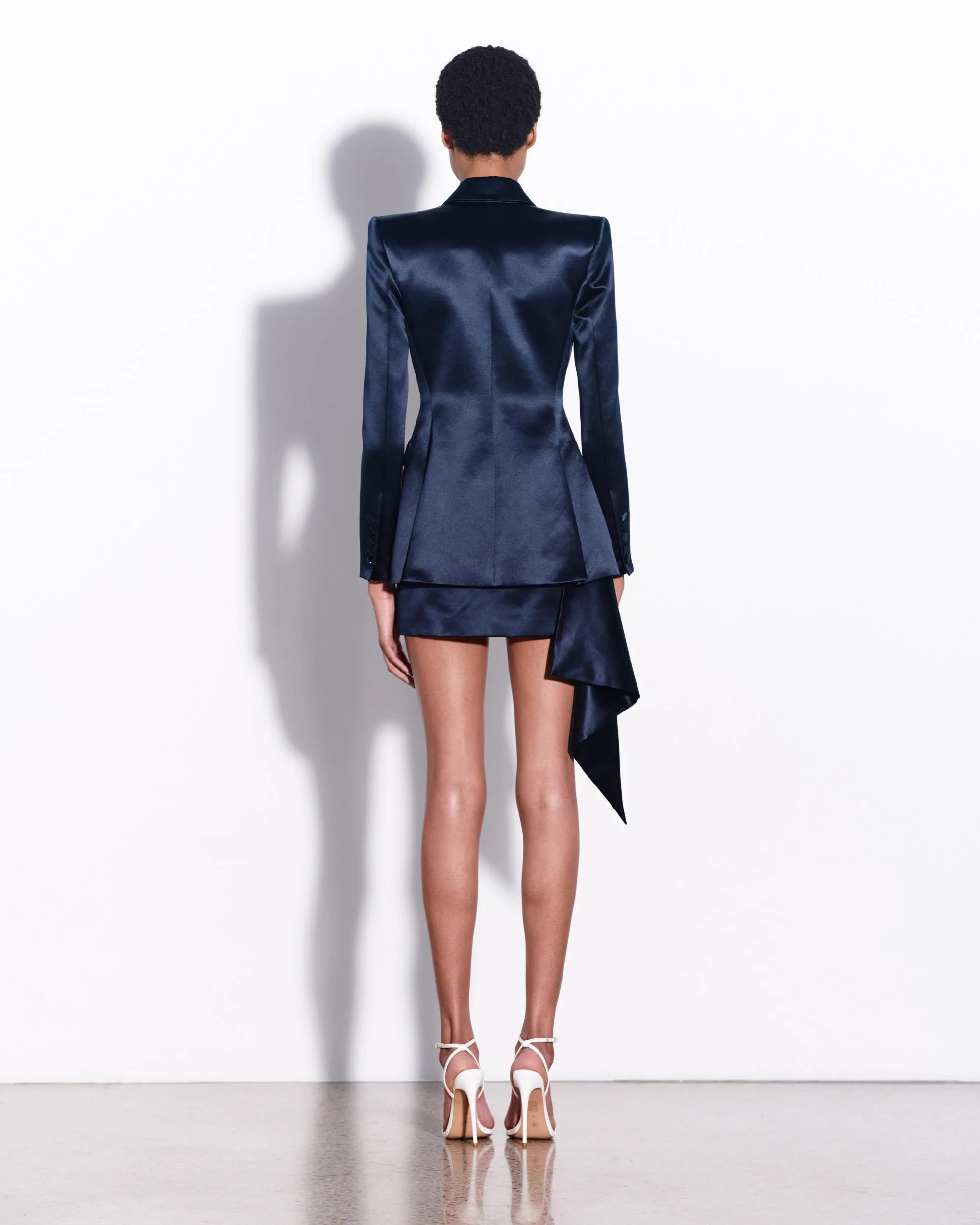 Styled with Single Breasted Fitted Blazer in Duchess Satin and Low Rise Draped Mini Skirt in Duchess Satin